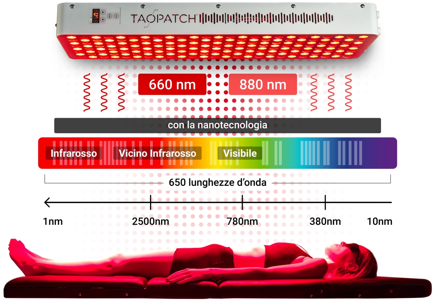 In questa nuova era, abbiamo a disposizione sia il trattamento di lungo termine, continuativo con la nanotecnologia Taopatch® che fornisce una micro integrazione di terapia luminosa, proprio come ogni giorno si prende la Vitamina C o qualcosa di cui si è carenti, sia uno strumento per fare una terapia di bassa, media o altissima intensità per dare al corpo, in una sola seduta, il nutrimento luminoso che prenderebbe in una settimana. Ora è possibile somministrare anche una terapia ad alto dosaggio di luce terapeutica del sole, senza gli effetti collaterali, che il corpo può gestire e tollerare.
